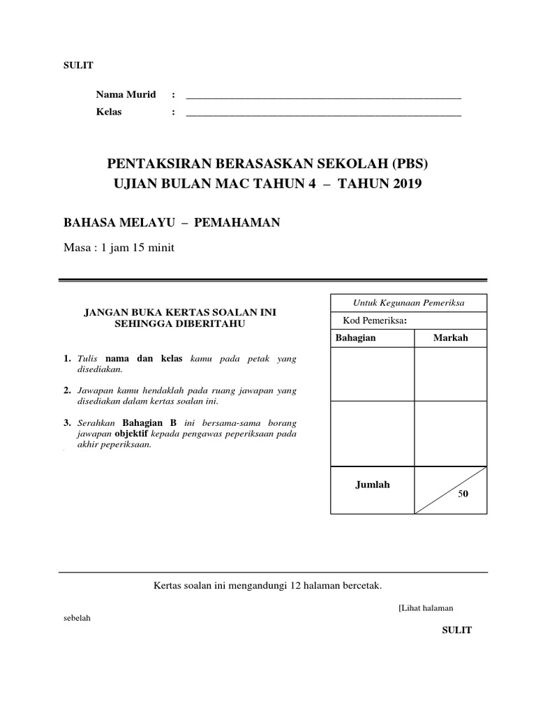 Ujian Bahasa Melayu Kertas 1 Bulan Mac 2019 Docx Cover Depan Pdf